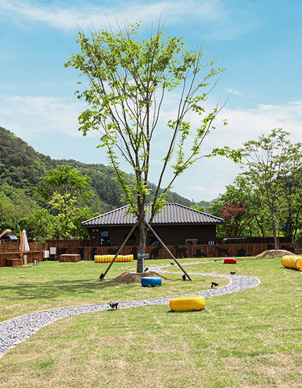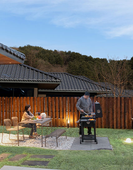 자연 잔디 마당에서 즐기는 야외 바베큐 플레이스